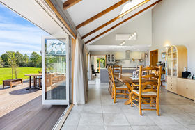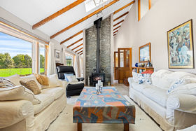 Inside, high ceilings and exposed timber beams crown expansive open-plan living, where a striking river-stone fireplace becomes the defining feature, balanced by the soft light of skylights above and a series of French doors and bifolds linking the indoors with the landscape.